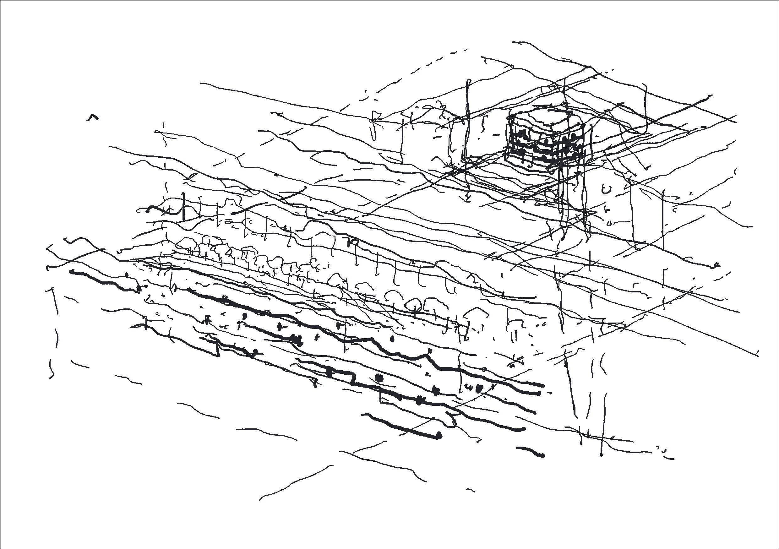 The mural was designed in collaboration with 26’10 Architects for a building which they designed at the Rahima Moosa Mother and Child Hospital. The view from the building for which the ceramic mural is designed looks upon a landscape which is representative of the essence of Johannesburg, and particularly its geological composition. The view shows a landscape of strata - the almost subterranean layer, the mine dump layer, the layer of buildings, the layer of the natural ridge, the layer of the electrical wire infrastructure, and the layer of the sky. The mural seeks to depict these layers, and see the buildings as similar to minerals floating within and outside of these layers. In essence, a depiction of the landscape which is viewed from the facade of the building, is represented by a mural made of ceramic tiles, which in turn adorns the facade of the building.
